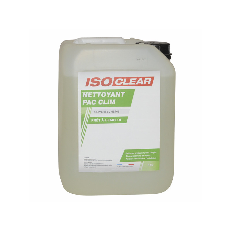 ISOCLEAR's CLIM NET08 cleaner is a ready-to-use solution designed to effectively remove deposits from condenser and evaporator coils in air conditioning systems. Its pH-neutral formula makes it safe to use and easy to transport. FEATURES Specific cleaner for air conditioning condensers and evaporators. Ready-to-use formula, no dilution required. pH neutral: enhanced safety during handling and transport. Contains an inhibitor that limits the reappearance of deposits and neutralises acid residues. No rinsing required, except for complete cleaning of the installation. USE Apply the product directly to the coils to be cleaned. Leave to act for a few minutes to dissolve the deposits. Rinsing is not necessary unless the system is being completely cleaned. ADVANTAGES Convenient ready-to-use cleaner Dissolves and removes deposits Improves system efficiency Safety information: Corrosive product, handle with care. For professional use only. Do not use for any purpose other than that for which the product is intended. Keep the container tightly closed. Store only in the original container, away from heat, in a dry, cool and well-ventilated place. Wear personal protective equipment, gloves, goggles and appropriate clothing.