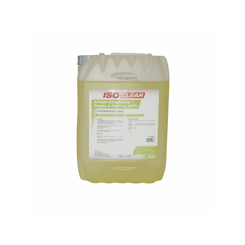 ISOCLEAR's ACP1 is a ready-to-use monopropylene glycol-based heat transfer fluid. It provides effective protection against freezing, foaming and metal corrosion. It is particularly recommended for heat pump installations. It contains an organic inhibitor. This product is bacteriostatic. ADVANTAGES: 2 functions in 1: Antifreeze + Corrosion inhibitor Recommended for heat pump installations, Freezing point -25°C Protection against freezing and metal corrosion Free from BORAX and NITRATE USE: Ensure that the installation is thoroughly cleaned and rinsed before injecting the product. Safety information: Antifreeze must be used with caution. Ensure that you choose the right antifreeze for your system and follow the recommended dosages. Incorrect use may result in damage to the installations, risk of leaks or reduced performance of the heating system. For professional use only. Do not use for any purpose other than that for which the product is intended. Keep the container tightly closed. Store only in the original container, away from heat, in a dry, cool and well-ventilated place. Wear personal protective equipment, gloves, goggles and appropriate clothing.