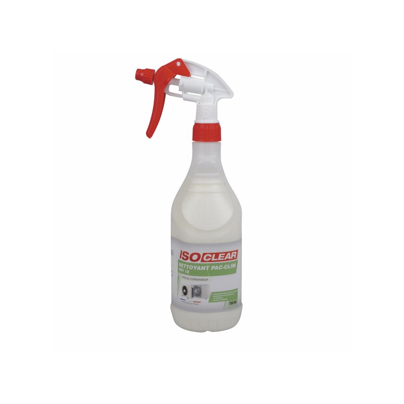 ISOCLEAR's PAC CLIM NET18 cleaner is a ready-to-use solution designed to effectively remove deposits and impurities from condenser coils in air conditioning systems or heat pumps. It guarantees optimal equipment performance while extending its service life. CHARACTERISTICS: Specific cleaner for air conditioning and heat pump condensers. Ready-to-use formula: no dilution required. Removes dirt and grime from metal surfaces. Comes in a 750 ml spray bottle for easy application. ADVANTAGES: Convenient, ready-to-use cleaner. Improves system efficiency. USE: Apply only to recommended surfaces (condenser coils). Spray the product directly onto the surface, leave to act, then rinse if necessary. Follow the recommended dosage to avoid damaging the equipment. Use with care to ensure the safety and performance of the system. Safety information: For professional use only. Do not use for any purpose other than that for which the product is intended. Keep the container tightly closed. Store only in the original container, away from heat, in a dry, cool and well-ventilated place. Wear personal protective equipment, gloves, goggles and appropriate clothing.