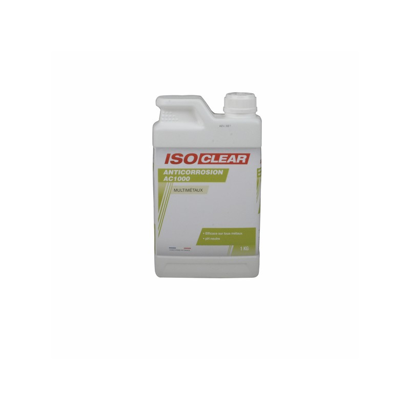 ISOCLEAR's AC1000 is an effective corrosion inhibitor for all metals. It provides long-lasting protection against corrosion by acting on aggressive agents in the water circuit. Its neutral pH protects users during handling in a circuit or during transport. With this anti-corrosion agent, maintenance ensures the performance of the installation. ADVANTAGES: Keeps users safe thanks to its neutral pH. Delays the onset of corrosion by neutralising aggressive agents in the water. Can be used on all types of metals. Maintains the energy efficiency of the installation. USE and DOSAGE: ISOCLEAR AC1000 is available in 1kg containers, enough to treat 100 litres of water in a network (i.e. a concentration of 1% in the circuit). AC1000 can be injected into a radiator using an injection pump (available from our online shop). Safety information: For professional use only. Do not use for any purpose other than that for which the product is intended. Keep the container tightly closed. Store only in the original container, away from heat, in a dry, cool and well-ventilated place. Wear personal protective equipment, gloves, goggles and appropriate clothing.