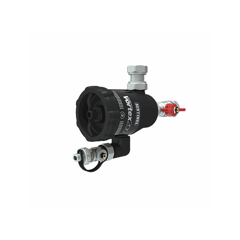The Sentinel Eliminator Vortex®200 filter removes all types of debris circulating in central heating installations to protect the boiler and to ensure correct operation and optimum performance of the installation.it is specially designed to be installed directly under the boiler in very tight spaces. Powerful neodymium iron boron magnets optimise retention of magnetite and the in-line grille prevents debris from returning into circulation. Collected debris can simply be flushed by removing the magnet from its housing and opening the drain valve at the bottom. Ultra-compact filter. Ideal for installation in restricted or confined spaces. Complete cleaning with easy access, without the need for special tools. Fast and efficient cleaning using the drain valve, for reduced on-site time, or by opening the filter for captured debris. Manufactured from robust materials originating from the automotive industry with high quality double seals and EU valves. Guaranteed robust design and low maintenance cost. 9,000 Gauss magnet and 200ml retention capacity Maximises the capture of debris from the first pass and continuously. Characteristics: Tank capacity: 200ml Compact: reduced height for easy installation in restricted spaces Dimensions: height 137mm, Length 213mm Safe drain valve: draining and cleaning in complete safety Dosage: compatible with SENTINEL Rapid-Dose® products (300ml) MF3/4" valve supplied Maximum temperature: 100°C Maximum pressure: 3b Maximum flow rate: 50 litres/min Assembly: horizontal mounting on the boiler Connections: 3/4" BSP female on top and 3/4" BSP male at back Weight: 0.7 kg