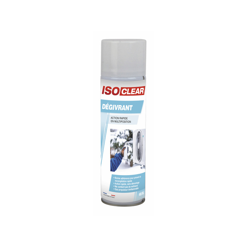 ISOCLEAR's alcohol and antifreeze-based liquid solution quickly defrosts external heat exchangers, collection trays, fans, condenser fins, split or multisplit units, etc., in order to maintain the efficiency of the installations. It can also be used on vehicle windscreens, locks, hinges, cables and any other mechanism blocked by frost.