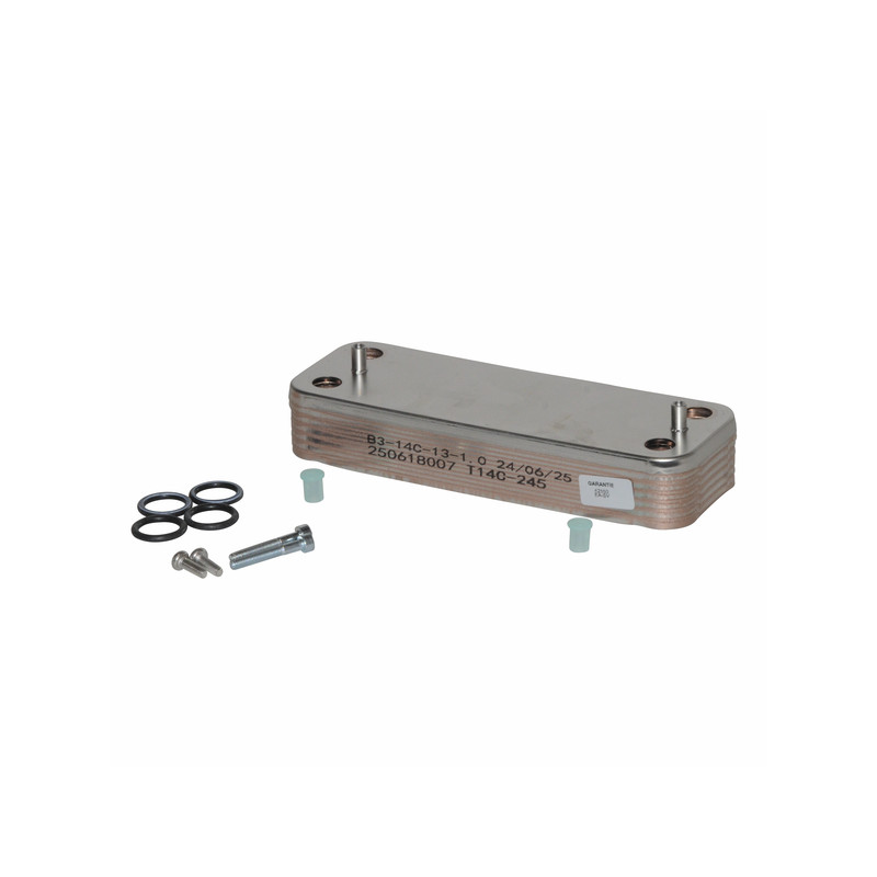 This sanitary heat exchanger is designed to ensure efficient heat transfer between the heating circuit and the domestic hot water circuit of De Dietrich Chappée boilers. Composed of 12 stainless steel plates, it guarantees excellent thermal conductivity and long-lasting corrosion resistance.