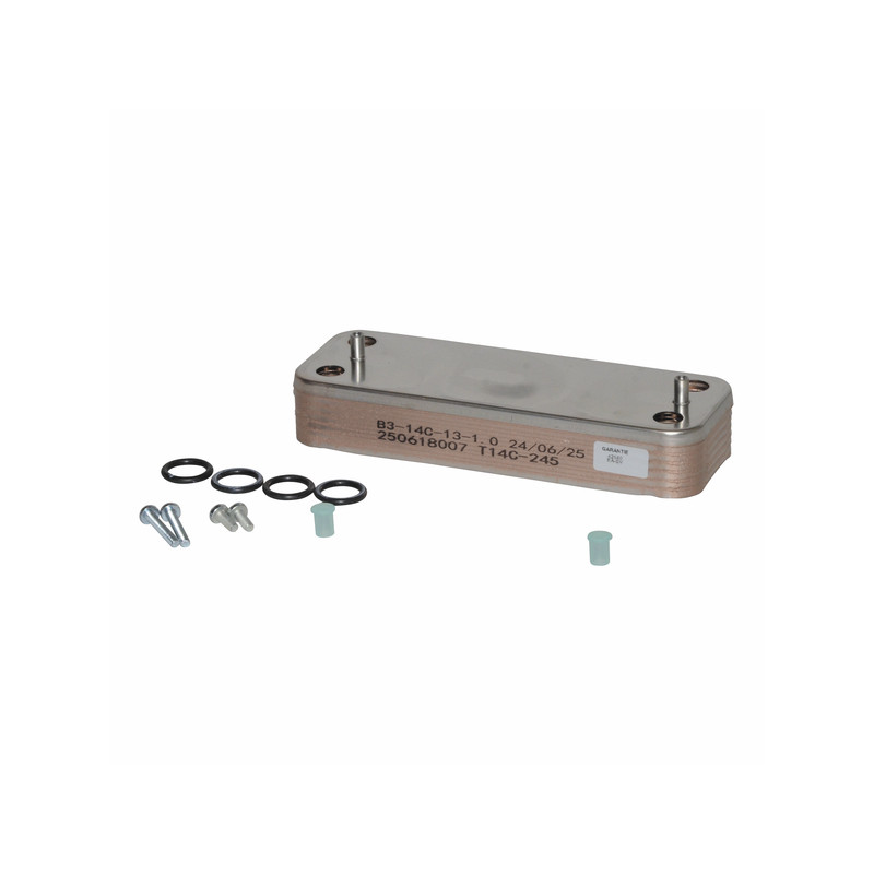 This plate heat exchanger is designed to ensure efficient heat transfer between the heating circuit and the domestic hot water circuit of De Dietrich Chappée boilers. Composed of 12 stainless steel plates, it guarantees excellent thermal conductivity and long-lasting corrosion resistance.