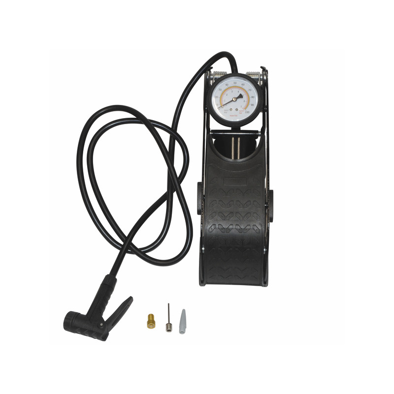 Foot pump with manometer 0to7 bars PSI, kg/cm2, bars, Kpa graduated . Supplied with hose 1.5 m long Fixing clip pedal with non slip surface