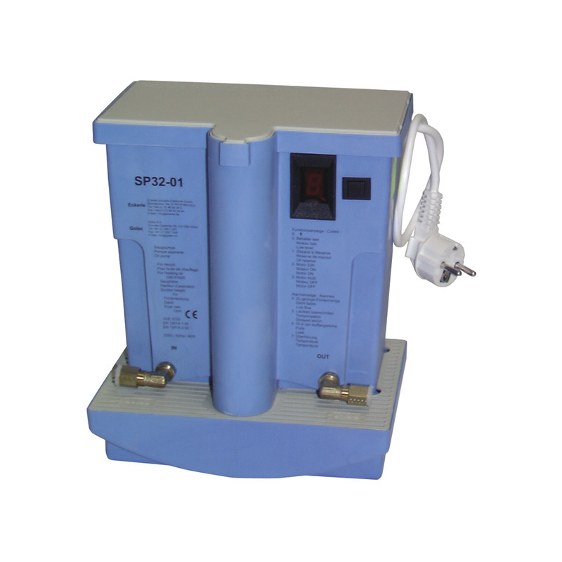 USESuck fuel tank and supply by fumaces gravity.This new pump has all thenew security standards and environmental protection. More ADVANTAGES: electronic working surveillanceat 100%, LCD view of differents working phases, quality of making and a fiability.A tank with an alarm is integrated to the pump. Easy installation on the wall.Ecological, this suction pump is used for the burner supply with nebulization, power below 80 kw, for burner with evaporation.This pump type is used for the automatic fuel supply of fuel domestic fumaces. The pump sucks the fuel of tank and fills it own tank. By gravity, fuel is distributed infuel fumaces. The tank ensures an intermittentoperation of the pump. There is an increase of lifetime and a noise level decrease. The tank capacity is of 1.6 litre. Capacity accumulator of 0.4 litre and the storage 1.2 litreType perfectly adapted to new security standards. Pipes are not under pressure and in case of suction pipe leak, the pump turns off and doesn't debit fuel.It is equipped in tank with a security float which activates alamr in case of leak in fuel tank or in fittings and in case of overflow.TECNICALS DATA:Dimensions : Height 285mmWidth 217mmDepth 168mmWeight : 2 KgFlow : 18 L/h with 4 m of suction and a storageof 1.6L12 L/h with 7 m of suction and a storage of 1.6LElectricals features : Single-phased 230V 50Hz, 40WADVANTAGES :Discrete working with 100% of security.Filter and non-return valve included in thepump.Tank and security of overflow with alarme.Motor protection if working dry.Stop pump if empty tank.Stop pump if damaged pipe.Stop pump if ambient temperature high.Digital view of working cycle or of distrubance.