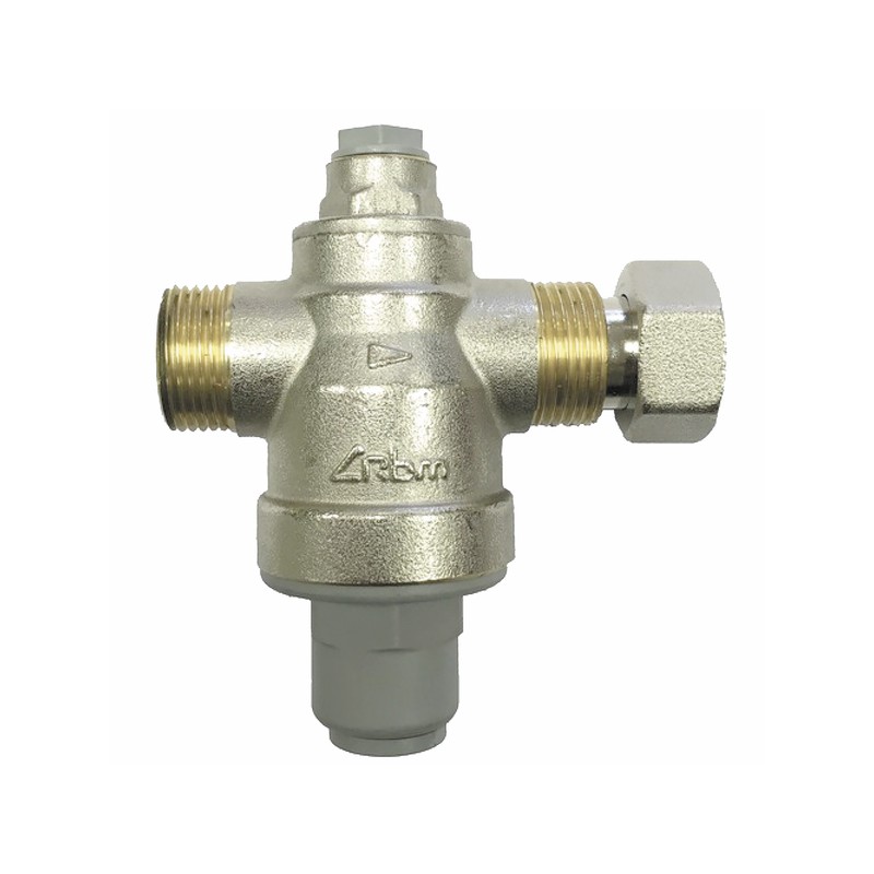 RinoxDue pressure reducing valve for water heaters. TECHNICAL CHARACTERISTICS: MM3/4? and FF1/2? with swivel nut 3/4? MF. Factory pre-setting 3 bar. Nominal pressure 25 bar. Max. operating temperature 80°C.Setting range 0.5 to 4 bar.